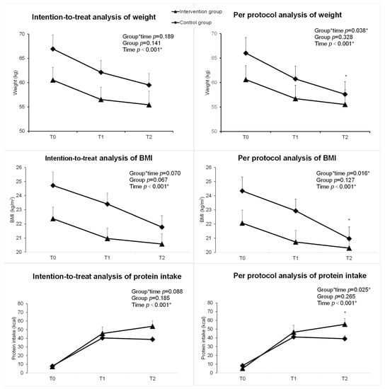 | Compliance with protein requirement | T0 | 0.10 (0.03) | 0.10 (0.02) | 9.57 | |||
