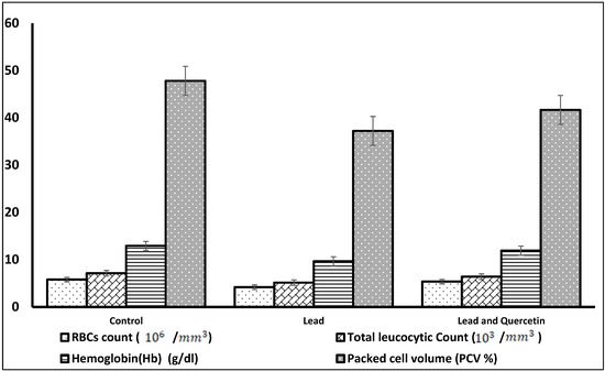 Rats in group 2, which were exposed to lead and did not receive quercetin, exhibited decreased hematological parameters. The decrements of Hb concentration and PCV% were obviously significant. Group 3 animals, who were exposed to lead and concomitantly received quercetin, disclosed an improvement of these parameters toward the control levels.