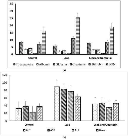Regarding the biochemical parameters, levels of total proteins, albumin and globulin were decreased in lead-exposed animals that did not receive quercetin (group 2) in relation to control levels. Rats in this group demonstrated significantly increased levels of urea, creatinine, BUN and bilirubin. The increments of urea and BUN levels were noticeable.