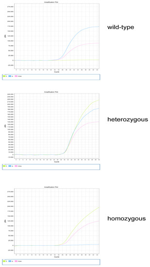 The exfoliated cells were collected with disposable oral swabs and subjected to DNA extraction using a commercial DNA extraction kit, following the manufacturers’ instructions. The extracted DNA was stored at −20 °C. The PCR amplification conditions were 37 °C for 10 min, 95 °C for 5 min, 95 °C for 15 s (40 cycles), and 60 °C for 60 s. The fluorescence channel settings used were FAM, VIC, and ROX. According to the comparison of the two fluorescence signal intensities, the genotype was determined as wild-type, heterozygous, or homozygous (Figure 1).