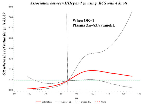 The statistical software SPSS 20 (IBM Corp., Armonk, NY, USA) was used for data processing and statistical analyses. Results with p < 0.05 were considered significant. The chi-square or Fisher’s exact tests were used for categorical variables, and a one-way analysis of variance was used for continuous variables. Odds ratios (ORs) with 95% confidence intervals were estimated using logistic regression analysis. We also used restricted cubic splines (RCSs) to test for linearity and explore the shape of the dose–response effect between plasma Zn concentration and HHcy.