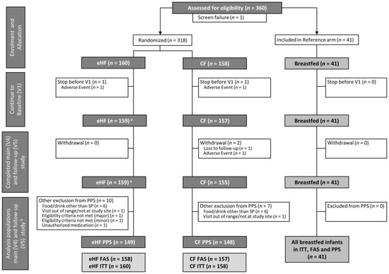 In total, 318 infants were randomised to FF, 41 breastfed infants were included in BF (Figure 1). The drop-out rate was low and overall compliance was high. Twenty-one participants from FF had major protocol deviations or did not complete the main study up to V4. All participants who completed V4 also completed V5. There was no apparent difference between eHF and CF regarding the frequency of deviations or proportion of infants that were excluded from PPS. All infants in BF completed the study per protocol.