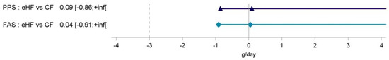 Noninferiority of eHF compared to CF was shown in PPS and FAS by confirming that the lower limit of the one-sided 97.5% CI for the difference in mean daily weight gain, (−0.86 g/day in PPS, −0.91 in FAS) was greater than −3.0 g/day (p < 0.0001 for noninferiority testing) (Figure 2).