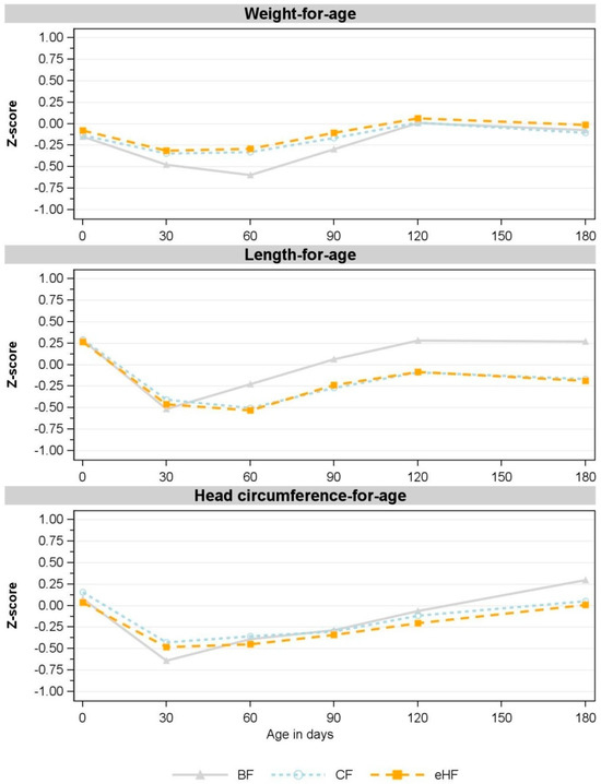 Z-scores derived using WHO Child Growth Standards [28] were comparable between eHF and CF and indicated no statistical differences at any time point (Figure 3). All mean z-score values were within ±0.75.