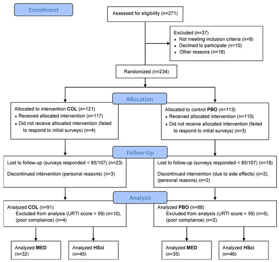 Although all participants within COL and PBO groups were subjects of identical treatment in accordance with trial protocol, we have dissected our trial groups based on the course of the study for final analysis. Thus, we obtained two major groups—MED and Hsci—which differed in some important respects, such as study workload and exposure to the infectious factors. Both of these factors were related to the course of the study in our experimental population. The workload is seemingly much larger in the medicine program than other HSci studies, which is a common opinion, fully substantiated by the experiences of our research team members—mostly medical university teachers. All of the participants in the MED group of our trial were 3rd year students and attended their practical classes in hospital units and outpatient clinics on a regular basis, which created a high risk of contact with infectious factors. The majority of our HSci students were 1st year students and had most of their classes held in lecture halls, dedicated classrooms or an online setting (due to the COVID-19 risk). According to these faculty groups’ characteristics, we obtained a group of potentially increased risk of URTIs (MED) and the control group with regular risk (HSci).