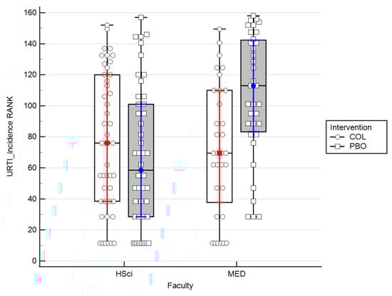 To assess the efficacy of colostrum (COL) in reducing the frequency of URTIs, we analyzed the number of days in which participants observed any symptoms of URTIs based on weekly reports over the entire experiment period (107 days). Analyzing all participants together, we found an insignificantly lower number of days with any URTIs symptoms in subjects receiving colostrum compared to those receiving placebo (COL: 6 (2–15.25) vs. PBO: 9 (2–18.5); p = 0.21). However, when we analyzed the influence of supplement vs. placebo in regard to faculty (MED vs. HSci), it turned out that the intervention with colostrum significantly diminished the number of days with symptoms of URTIs in the MED group. We found a tendency towards statistically significant difference by intervention (f(1) = 3.006, p = 0.085), a significant difference by faculty (f(1) = 6.53, p = 0.012), and a significant interaction between these variables (f(1) = 10.42, p = 0.002; Figure 2).