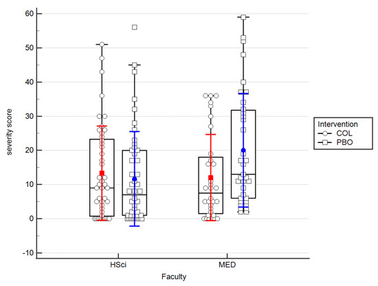 When we summed up the URTIs symptoms severity results and analyzed them collectively in all trial participants within both intervention groups (COL and PBO) over the entire observation period, these scores were higher in the placebo group, but insignificantly (COL: 9 (1–22.5) vs. PBO: 11 (2.75–23.75; p = 0.31). When we split the participants according to faculty (medicine vs. others) though, we were able to demonstrate insignificant interaction between the independent variables (by intervention (f(1) = 1.91, p = 0.169), by faculty (f(1) = 2.37, p = 0.126) and a statistically significant interaction between these variables (f(1) = 4.51, p = 0.035; Figure 3).