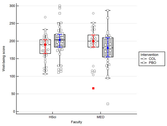 A bar plot on the efficacy of COL in shaping well-being score by the course of studies. Medians and IQRs are shown. Dots and squares depict individual cases. MED—medicine; HSci—health Science.