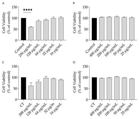 Safety profile of T. capitata essential oil (EO) and hydrodistillation residual water (HRW) towards macrophages (A,B) and fibroblasts (C,D). **** p < 0.0001 when compared to control after one-way ANOVA followed by Dunnet’s multiple comparison test.