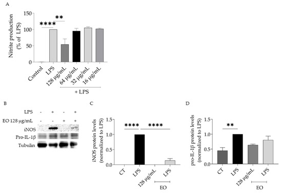 Anti-inflammatory potential of T. capitata essential oil (EO). Effect of the EO on nitrite production (A) and protein levels of iNOS (B,C) and pro-IL-1β (B,D) in lipopolysaccharide (LPS)-stimulated macrophages. ** p < 0.01, and **** p < 0.0001 when compared to control (CT) or LPS after one-way ANOVA followed by Dunnett’s multiple comparison test.