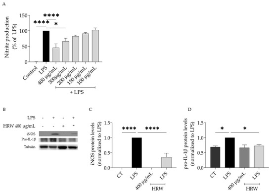 Anti-inflammatory potential of T. capitata hydrodistillation residual water (HRW). Effect of the HRW on nitrite production (A) and protein levels of iNOS (B,C) and pro-IL-1β (B,D) in lipopolysaccharide (LPS)-stimulated macrophages. * p < 0.05. Furthermore, **** p < 0.0001 when compared to control (CT) or LPS after one-way ANOVA followed by Dunnett’s multiple comparison test.