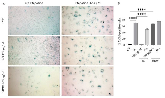 Considering the bi-directional crosstalk between inflammation and cellular senescence [80,81] and that both T. capitata extracts exert potent anti-inflammatory effects, we aimed to assess if their presence could decrease cellular senescence, assessed by the evaluation of senescence-associated β-galactosidase activity. As expected, control cells had negligible β-galactosidase activity; however, etoposide (12.5 µM) treatment significantly increased the percentage of β-galactosidase-positive cells significantly increase (Figure 7A,B). Interestingly, when the EO was added to cells in the recovery phase, the β-galactosidase activity was greatly reduced (49% vs. 70%), while the EO alone had no effect on the activity (Figure 7A,B). Unexpectedly, the presence of HRW alone significantly induced the activity of β-galactosidase activity to an extent similar to that of etoposide (67% vs. 70%); however, when cells were pre-treated with etoposide prior to the addition of HRW, the extract did not promote the effect of the positive control (Figure 7A,B).