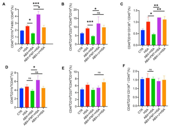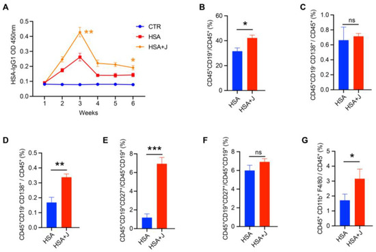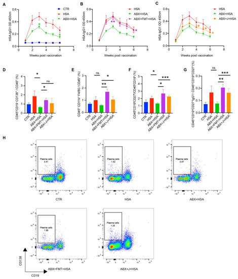 The total number of mice used in the experiment was 80. To explore HSA vaccination response on ABX-treated mice, each group had 8 mice (CTR, HSA, ABX+HSA, ABX+J+HSA, and ABX+FMT+HSA groups). To explore HSA vaccination response of healthy mice, each group had 10 mice (CTR, J, HSA, and HSA+J groups). There was no excluded number of deaths/accidents in the experiment. All animal experimental methods were conducted according to the guidelines of the Animal Care and Use Committee of Tsinghua University (No. 20-LZ1#). The animal study protocol was approved by the Animal Care and Use Committee of Tsinghua University (protocol code No. 20-LZ1# and date of approval: 1 May 2020–1 May 2026).” for studies involving animals.