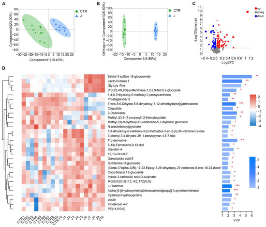 The effect of jujube on the metabolite structure and composition of gut microbiota in mice. (A) Partial least squares discriminant analysis based on metabolism variations between the jujube and control groups. (B) Orthogonal partial least squares discriminant analysis based on metabolism variations between the jujube and control groups. (C) Volcano plot of differences in metabolites between the jujube and control groups (p < 0.05); variable importance in the projection of orthogonal partial least squares discriminant analysis (VIP_OPLS-DA > 1). (D) Heatmap of important changes in gut microbiota metabolites in each mouse. * p < 0.05, ** p < 0.01, *** p < 0.001.