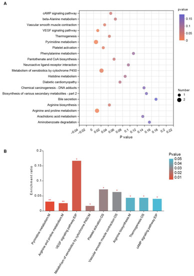 KEGG pathway enrichment analysis reveals the biological significance of gut microbiota metabolites by feeding jujube. (A) Bubble chart of KEGG pathway enrichment between the jujube and control groups. (B) Significant metabolites of the KEGG pathway enrichment between the jujube and control groups. * p < 0.05, ** p < 0.01.