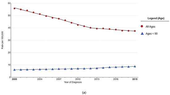 (a). A recent trend in SEER Age-adjusted colorectal cancer incidence rate from 2000 to 2019. This figure was created by https://seer.cancer.gov/statistics-network/explorer (accessed on 15 February 2023). (b) Increase in early-onset colorectal cancer incidence rate. This graph is created based on the summary of the published articles by Siegel, R.L. et al. [9].
