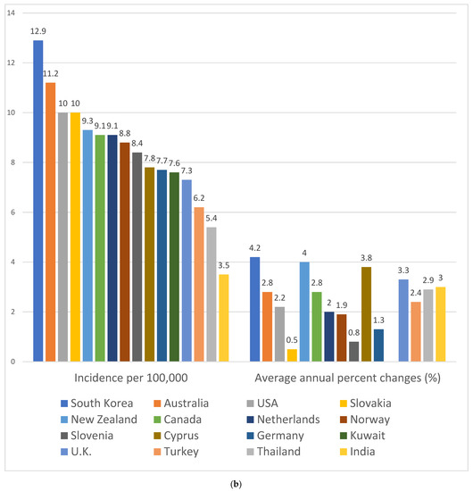 - Gupta, S.; Harper, A.; Ruan, Y.; Barr, R.; Frazier, A.L.; Ferlay, J.; Steliarova-Foucher, E.; Fidler-Benaoudia, M.M. International Trends in the Incidence of Cancer Among Adolescents and Young Adults. J. Natl. Cancer Inst. 2020, 112, 1105–1117. [Google Scholar] [CrossRef] [PubMed]