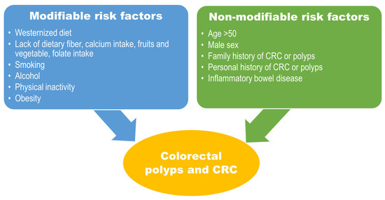 Risk factors for CRC have been well characterized based on many population-based cohort and case-control studies, primarily categorized into modifiable and nonmodifiable, as shown in Figure 3. Although the risk factors are reported mainly from the older population, data on the younger population indicate that, as in elderly individuals, risk factors related to the Western diet and sedentary lifestyle pose a significant increase in developing CRC [44]. Westernized diets characterized by high fat, high sugar intake with processed or red meat and physical inactivity symbolize human development and industrialization, which are tightly linked to obesity and obesity-related chronic disease or malignancy [2,3,45,46]. This phenomenon is well reflected by the trend of CRC incidence in Asia, particularly China, Japan, South Korea, Singapore, and Taiwan, with a two- to fourfold increase [1,47]. Furthermore, there are notable disparities in EOCRC incidence by geography and ethnicity in the United States [48]. High incidences are observed in regions like the southern states, Mississippi Delta and Appalachia [17]. Regarding racial disparity, the rise of EOCRC incidence is notable in Hispanic/Latino men and Whites, although CRC incidence has previously been high in African-American men [48]. Such disparities partly reflect poverty, unemployment, and poor access to the healthcare system among the younger population [48]. Nevertheless, easy access to poor-quality diets could contribute to the rising incidence of EOCRC.