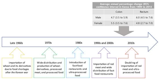 Following spectacular economic growth, a fast dietary transition to increased consumption of highly refined wheat and its derivatives, processed or red meat, and ultra-processed food took place for the past several decades in South Korea, as shown in Figure 4 [49,50]. It is not surprising that the prevalence of obesity increased from 6.8% to 10.0% in Korean children and adolescents aged 6 to 18 from 1998 to 2013 [51]. At the same time, type 2 diabetes among children 18 years or younger increased from 153.5 per 100,000 in 2006 to 205.0 per 100,000, a relative increase of 33.6% [51]. Furthermore, evaluating physical activity, screen time, and sleep duration, a cross-sectional study using national data indicated that only 1.6% of adolescents met the recommendation from the Canadian 24-h Movement Guidelines for Children and Youth, which consists of at least 60 min of moderate-to-vigorous physical activity, no more than 2 h of screen time, and 8–11 h of sleep duration over a typical 24-h day [52]. Worse yet, another study evaluating the 6-year prevalence trend adhering to the recommendation demonstrated that fewer than 1% of adolescents met all three recommendations consistently [53]. It is evident that early-life exposures to known risk factors, such as consuming ultra-processed food and insufficient physical activity, have prevailed among children and adolescents in Korea. Given that a long latency period for normal colonic mucosa to transform into cancer is necessary, profound physiologic and metabolic derangement starting early in life partly explains the increase in the incidence of sporadic EOCRC [54,55,56].