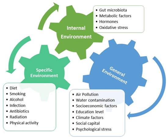 The advancement of genetic research and molecular epidemiology shows that environmental life-course exposures to risk factors play a fundamental role in disease expression [57]. In 2005, Wild suggested the concept of “exposome”, the individual’s environmental exposure from the prenatal period onward, as it matches the individual’s genome [58]. The exposome consists of three overlapping domains: the general external environment, the specific external environment, and the internal environment, as shown in Figure 5 [39,59]. It is difficult to place a particular exposure in one domain or another and to measure how much a particular exposure can cause disease in an individual when considering lifespan and different developmental periods [59]. However, epidemiologic studies have attempted to establish risk factors at a population level, and molecular pathological epidemiology of epigenetics reveals certain aberrant epigenetic signatures in identifying disease characteristics, particularly malignant neoplasms [57]. Epigenetic alterations, such as LINE-1 hypomethylation or CpG island methylator phenotype, are often associated with EOCRC [32,57]. Although specific exposomal data related to EOCRC are limited, an abundance of epidemiologic data and molecular research on CRC indicates that dietary habit, use of antibiotics, chemical exposures, smoking, and alcohol as exposomes have complex interactions with endogenous gut microbiota and host factors, stimulating inflammation, cell proliferation, and genetic mutation [40].