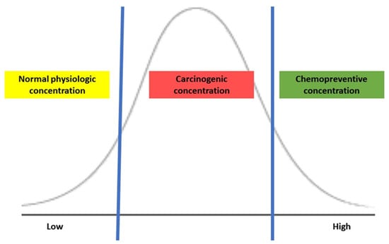 The biological effects of H2S depend on its concentration in the colonic lumen, and the luminal concentration is mainly determined by endogenous production by bacterial metabolism, which influences H2S-mediated tumorigenesis. Several in vitro studies of treating CRC cell lines with exogenous H2S reveal bell-shaped concentration responses in cancer, representing the dual effects of H2S [75]. When CRC cells were exposed to a slow-release H2S donor at a low concentration (0.2–0.3 micromole), mitochondrial function and glycolysis for energy production enhanced cancer cell proliferation by activating H2S-generating enzymes within cancer cells but were typically not present in colonic epithelial cells [86,87]. Additionally, the expression of H2S-producing enzymes was higher in CRC tissue than in normal surrounding tissues, possibly maintaining its optimal concentration for tumor growth and proliferation [85]. Conversely, treating CRC cells with a high concentration (1 millimole) of an H2S donor in the form of isothiocyanate, a molecular derivative from a cruciferous plant, induced the apoptosis of CRC cells [88]. As shown in Figure 6, the exogenous H2S demonstrates a concentration-dependent effect: maintenance of normal physiology at low, carcinogenic once reaching an upper threshold, then possibly chemopreventive at a high. Thus, maintaining an appropriate concentration of H2S may be critical to balance the cell cycle and regulating apoptosis and tumorigenesis.