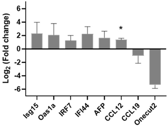 | Oas1a | 2.21 | 2.04 | Ccl19 | −0.57 * | - |