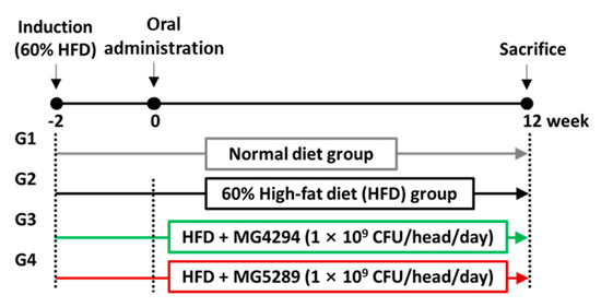 The experimental schedule is shown in Figure 1. After 1 week of acclimatization, all animals (except for the six mice in the normal diet group) were fed a 60% HFD (D12492, Research Diets, Inc., New Brunswick, NJ, USA) 2 weeks early to induce obesity [12]. After the completion of obesity induction, their body weights were measured, and groups were divided so that the averages of the measured weight values between groups were similar. They were split into four groups (n = 6 per group) as follows: (1) normal (ND) group, (2) HFD group, (3) HFD + MG4294 (1 × 109 CFU/head/day) group, and (4) HFD + MG5289 (1 × 109 CFU/head/day) group. The mice were administered probiotics via oral gavage and were provided with 60% HFD feed for 12 weeks. Their body weights were checked once a week to observe the condition of the experimental animals. After 12 weeks, all animals were sacrificed by inhalational anesthesia with isoflurane, and their blood was drawn through the abdominal vena cava.