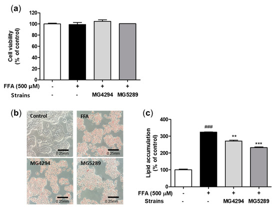 As a result of the cell viability of L. fermentum MG4294 and L. plantarum MG5289 treated with FFA in HepG2 cells, there was no significant change (Figure 2a). To confirm the lipid accumulation inhibitory effect of L. fermentum MG4294 and L. plantarum MG5289, Oil Red O staining was performed, and lipid droplets were observed through a microscope, as shown in Figure 2b,c. The contents of stained lipid droplets in FFA-induced HepG2 cells were more than that of the control, and the lipid accumulation was also significantly increased in FFA-induced HepG2 cells. In contrast, stained lipid droplets and accumulation were significantly decreased by treatment of L. fermentum MG4294 and L. plantarum MG5289 with FFA in HepG2 cells.