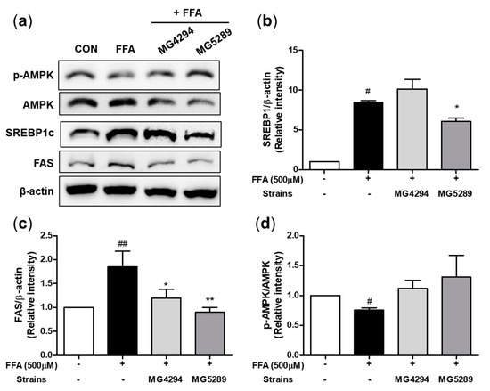 To confirm the effect of L. fermentum MG4294 and L. plantarum MG5289 on FFA-induced HepG2 cells, the expressions of adipogenesis-related proteins were measured (Figure 3). Expression of SREBP1c (p < 0.05) and FAS (p < 0.01) was increased, and p-AMPK (p < 0.05) was significantly reduced by the FFA induction in HepG2 cells. The L. plantarum MG5289 significantly decreased the expression of SREPB1c (p < 0.05) and FAS (p < 0.01) and increased the p-AMPK; however, L. fermentum MG4294 significantly reduced only the expression of FAS (p < 0.05).