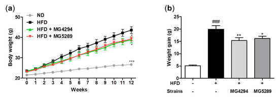 During the entire animal study period, no deaths or abnormal symptoms were observed due to the administration of probiotics. The body weight of L. fermentum MG4294 and L. plantarum MG5289 treated groups was less than that of the HFD group, respectively (Figure 4a). In addition, L. fermentum MG4294 and L. plantarum MG5289 treated groups showed a significant decrease in weight gain by 22.93% (p < 0.01) and 18.91% (p < 0.05) compared to the HFD group (Figure 4b).