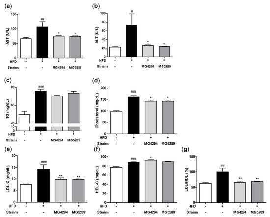 Serum analysis results for all biochemical parameters are shown in Figure 4. The levels of AST and ALT, indicators of liver toxicity enzyme, significantly decreased in the L. fermentum MG4294 and L. plantarum MG5289 treated groups compared to the HFD group (p < 0.05; Figure 5a,b).