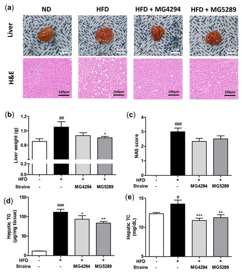 The liver weight of the L. fermentum MG4294 and L. plantarum MG5289 treated groups decreased by 11.46% and 14.14% (p < 0.05) compared to the HFD group (Figure 6b). As a result of NAS, hepatic TG, and hepatic TC, which are indicators of liver dysfunction, a statistically significant increase was observed in the HFD group compared to the ND group (p < 0.001, p < 0.001, and p < 0.05; Figure 6b). All factors were decreased in the L. fermentum MG4294 and L. plantarum MG5289 treated groups, particularly in hepatic TG (p < 0.05) and hepatic TC (p < 0.001 and p < 0.01).