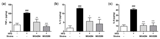 The effect of treatments of L. fermentum MG4294 and L. plantarum MG5289 on pro-inflammatory cytokine levels in the intestinal tissues of mice induced by HFD was confirmed through ELISA analysis (Figure 8). In the HFD group, the levels of all cytokines, including TNF-α, IL-1β, and IL-6, were significantly increased in the intestinal tissues of the mice (p < 0.001). In contrast, L. fermentum MG4294 and L. plantarum MG5289 treated groups had significantly decreased levels of TNF-α (p < 0.01 and p < 0.001), IL-1β (p < 0.05 and p < 0.01), and IL-6 (p < 0.001) in intestinal tissues of HFD-induced mice.
