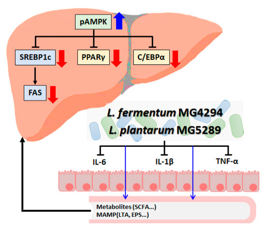 Effects of L. fermentum MG4294 and L. plantarum MG5289 on NAFLD by modulating of gut–liver axis. Thick blue arrows, increased expression by MG4294 and MG5289; thick red arrows, decreased expression by MG4294 and MG5289; thin blue arrow, generating metabolites by MG4294 and MG5289.