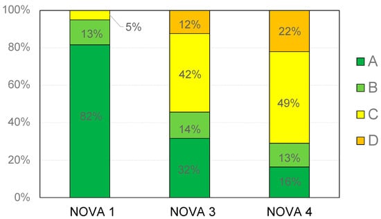 Finally, no products with Nutri-Score D were found in the NOVA 1 group, while 7 items (12%) and 51 items (22%) with Nutri-Score D were found in the NOVA 3 and NOVA 4 groups, respectively. No products displayed a Nutri-Score E.