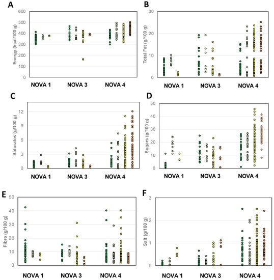 Energy (A) and nutrient (B–F) content of breakfast cereals grouped on the basis of NOVA group and Nutri-Score. Legend of Nutri-Scores: