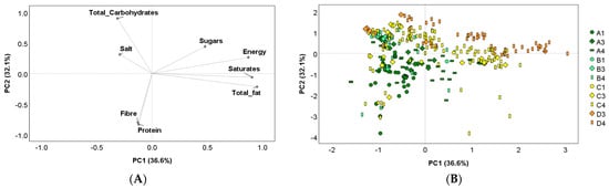 Principal component (PC) analysis describing the intra-group variability of products based on their nutrient composition (energy (kcal/100 g), total fat (g/100 g), saturates (g/100 g), total carbohydrates (g/100 g), sugars (g/100 g), protein (g/100 g), fibre (g/100 g), and salt (g/100 g)). Loading plots (A) of PC1 versus PC2; score plots (B) of the nutrient composition of each product analyzed organized according to Nutri-Score. Legend: legend is composed of letters (A to D) indicating the letters of the Nutri-Score and numbers (1, 3, and 4) indicating the NOVA groups.