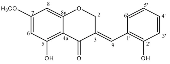 A chemical structure of (E)-5-hydroxy-7-methoxy-3-(2-hydroxybenzyl)-4-chromanone (HMC).