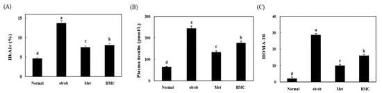 Five-week-male C57BL/6J-Jms Slc wild-type mice (n = 8) and five-week-male C57BL/6J ob/ob mice (n = 24) were obtained by Joong Ang Animal Co. (Seoul, Republic of Korea). Mice were housed at the same temperature (24 °C) and humidity (55%). The adaptation period was two weeks, after which the normal group (n = 8) and ob/ob mice were divided into 3 groups (n = 8 each). The normal group and the ob/ob control group received the same amount of 0.9% Nacl solution, the ob/ob Met group received metformin 150 mg/kg∙BW, and the ob/ob HMC group received HMC 30 mg/kg∙BW by oral gavage once per day. After 30 days, the animals were fasted for 12 h and anesthetized with CO2, and blood was obtained from the inferior vena cava for biomarker testing. Animal testing procedures were conducted in compliance with current international laws and policies (PNU Guide for the Care and Use of Lab Animals, PNU-2022-0112).