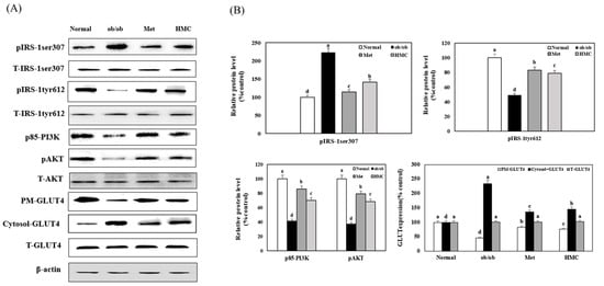 HM-chromanone improved IRS-1/AKT pathway in skeletal (gastrocnemius) muscle of ob/ob mice: (A) pIRS-1ser307, Total (T)-IRS-1ser307, pIRS-1tyr612, T-IRS-1tyr612, p85-PI3K, pAKT, and T-AKT expression; (B) expression levels of pIRS-1ser307, pIRS-1tyr612, p85-PI3K, pAKT, and PM-GLUT4. Normal group: C57BL/6J wild type mice (n = 8); ob/ob group: C57BL/6J ob/ob mice (n = 8); Met group: C57BL/6J ob/ob mice administered with metformin 150 mg/kg body weight as positive control (n = 8); HMC group: C57BL/6J ob/ob mice administered with HM-chromanone 30 mg/kg body weight (n = 8). Each value is expressed as the mean ± SD (n = 8). Values with different superscript letters are significantly different (p < 0.05) based on Student–Newman–Keuls tests.