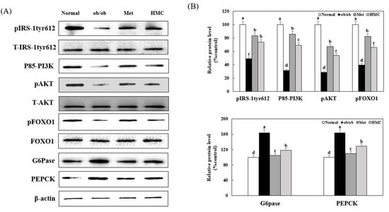 HM-chromanone improved AKT/FOXO1 pathway in the liver of ob/ob mice. (A) pIRS-1tyr612, total (T)-IRS-1tyr612, p85-PI3K, pAKT, T-AKT, pFOXO1, FOXO1, G6Pase, and PEPCK expression. (B) Expression levels of pIRS-1tyr612, pPI3K, pAKT, pFOXO1, G6Pase, and PEPCK. Normal group: C57BL/6J wild type mice (n = 8); ob/ob group: C57BL/6J ob/ob mice (n = 8); Met group: C57BL/6J ob/ob mice administered with metformin 150 mg/kg body weight as positive control (n = 8); HMC group: C57BL/6J ob/ob mice administered with HM-chromanone 30 mg/kg body weight (n = 8). Each value is expressed as the mean ± SD (n = 8). Values with different superscript letters are significantly different (p < 0.05) based on Student–Newman–Keuls tests.