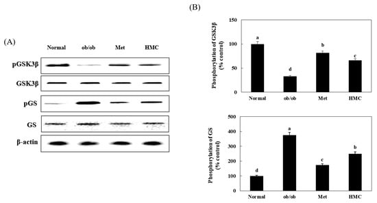 Figure 6 indicates the effect of HMC on GS and GSK3β expression in the liver of ob/ob mice. Compared with the normal group (100%), pGSK3β expression in the ob/ob group was significantly reduced to 33.12%. On the other hand, the pGSK3β expression in the HMC group was 66.01%, which was markedly increased compared to that of the ob/ob group (p < 0.05). In addition, the pGS expression level was increased to 374.91% in the ob/ob group compared to the normal group (100%). The pGS expression level in the HMC group was reduced to 249.81% compared to that in the ob/ob group.