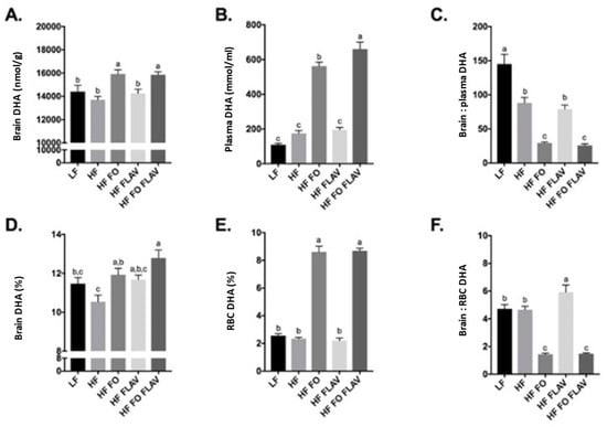 Effect of diet on brain, plasma, and red blood cells DHA content in mice, expressed in nmol/g of brain tissue (A), mmol/mL of plasma (B), and as % of total fatty acids (D,E). (C,F) are ratios of brain to plasma and brain to RBCs DHA concentrations respectively. Values are expressed as means ± SEM. One-way ANOVA Tukey’s post-hoc test adjusted p-values. a, b, c: columns (groups) with different letters are significantly different at p = 0.05, while columns sharing the same letters are not significantly different. Data of each dietary group was obtained from APOE3 and APOE4 mice combined. Number of mice per dietary group: LF n = 20, HF n = 21, HF FO n = 19, HF FLAV n = 19, and HF FO + FLAV n = 19.