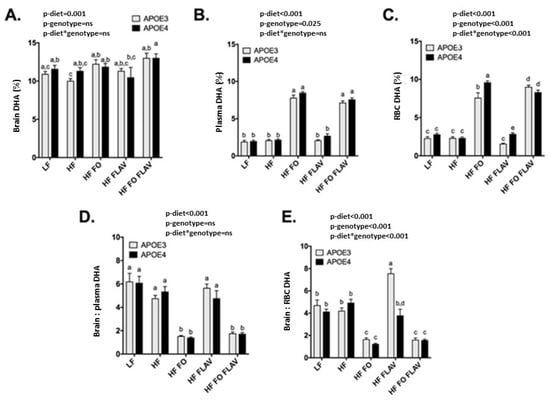 Effect of diet and genotype in the brain, plasma, and red blood cells DHA content of APOE3 and APOE4-TR mice, expressed in % of total fatty acids (A–C) and ratios of brain: plasma (D) and brain: RBC DHA (E). Values are expressed as means ± SEM. a, b, c, d: columns (groups) with different letters are significantly different at p = 0.05, while columns sharing the same letters are not significantly different. Number of mice in each dietary and genotype group are: LF APOE3 n = 11, LF APOE4 n = 9, HF APOE3 n = 13, HF APOE4 n = 8, HF FO APOE3 n = 11, HF FO APOE4 n = 8, HF FLAV APOE3 n = 10, HF FLAV APOE4 n = 9, HF FO + FLAV APOE3 n = 10, and HF FO + FLAV APOE4 n = 8. P-diet*genotype: significance of diet and genotype interactive effect.