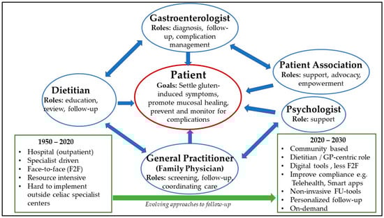 General practitioners (GPs) and other primary care providers may play an important role in family screening and FUs of previously diagnosed CeD patients; however, their ability to effectively do this will depend on patient load. GPs will be a solution if the critical number of diagnosed celiacs in a local population is high enough, such as in Finland [79]. However, GPs nowadays are burdened with increasing workloads in various western countries [80]. This might be a particular problem for CeD patients, who need additional time to have their health issues addressed. Then, again, a minimal critical number of CeD patients per GP is required; otherwise, GPs are not yet a beneficial option for the majority of CeD patients for FU as their medical experience, without sufficient guidance, as these will be inadequate to manage specific CeD needs.