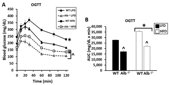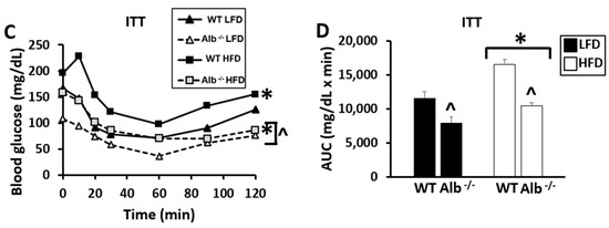 For blood glucose levels during the OGTT and ITT, Alb