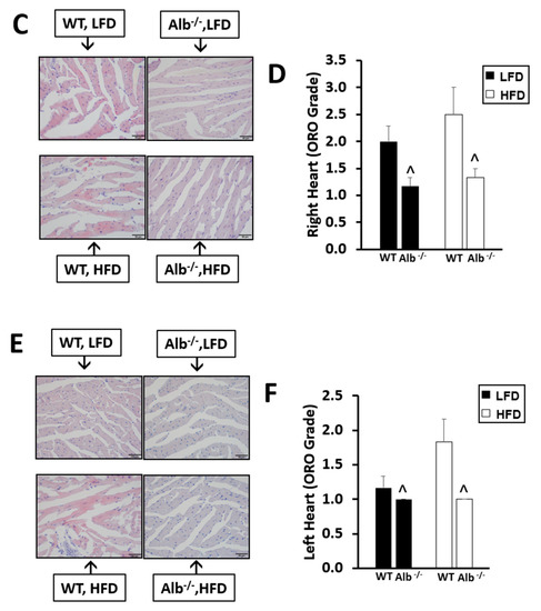 −/− mice did not suffer from cardiac steatosis. Compared to WT in both LFD and HFD, Alb