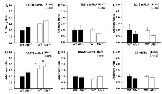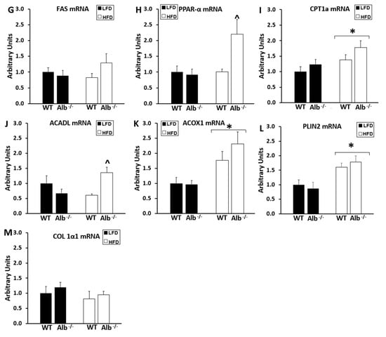 −/− mice on the HFD exhibited higher expression than WT mice for PPAR-α and ACADL, suggesting a potentially elevated capacity to oxidize fatty acids. Adipose tissue in obese Alb