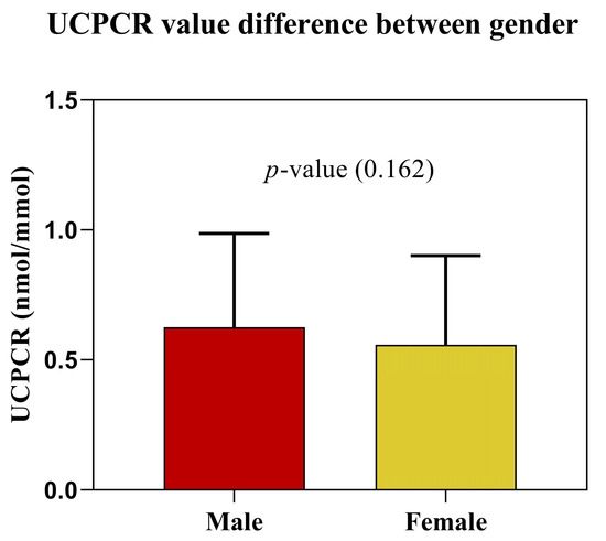 After normalization for individual urinary creatinine, UCPCR values in women and men did not show significant differences (p-value = 0.162).