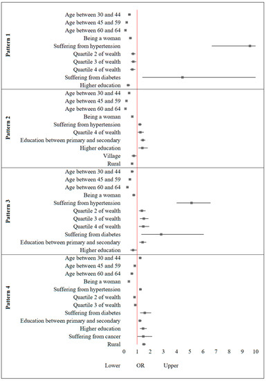 Figure 2 shows the graph of the OR and confidence intervals adjusted by the dietary pattern, where the relevance of suffering from a chronic disease in relation to adopting pattern 1 and 3, the positive relationship between socioeconomic and cultural characteristics with patterns 2 and 3 or the role of the youngest age group in relation to pattern 4 can be observed.
